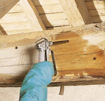 Des produits insecticides et fongicides sont injectés en profondeur dans le bois à l’aide de buses spécifiques.